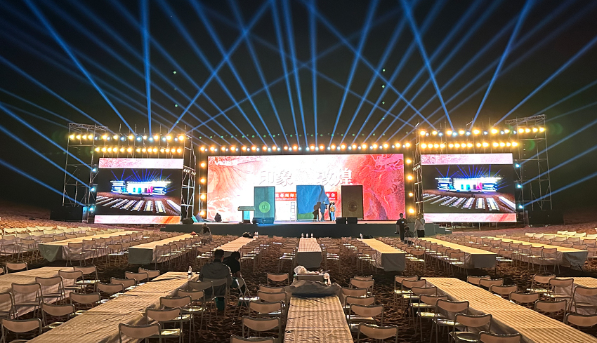 梵蒂詩敦煌系列新品發(fā)布活動沙漠場地燈光音響調試現(xiàn)場